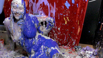 Showering Satine in her lovely cat print leggings and scant rainbow halter neck top with many litres of vivid yellow gunge!